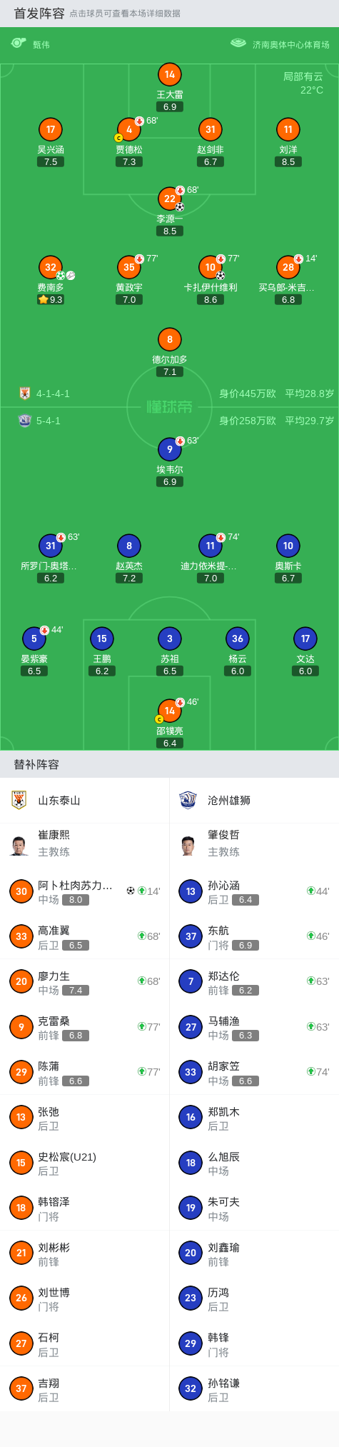 山东泰山首发:14-王大雷, 32-费南多, 10-卡扎伊什维利, 17-吴兴涵, 22-李源一, 8-德尔加多, 11-刘洋, 4-贾德松, 35-黄政宇, 31-赵剑非, 28-买乌郎-米吉提