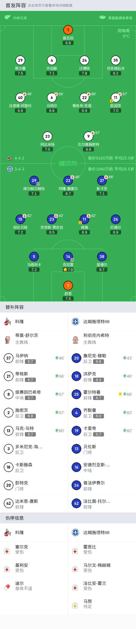 科隆首发:11-凯因茨, 1-施瓦伯, 23-阿达米扬, 9-瓦尔德施密特, 4-许伯斯, 24-沙博特, 22-雅各布-克里斯滕森, 6-马特尔, 40-法里德-阿里杜, 29-蒂尔曼, 35-芬克格拉夫