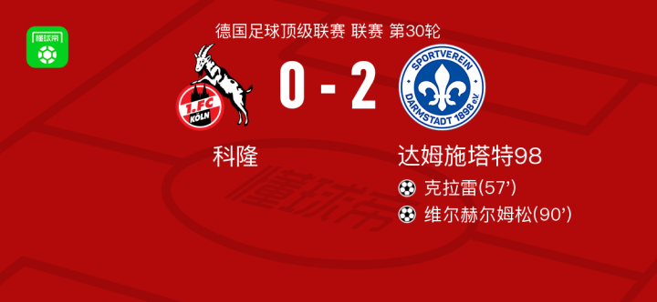 达姆施塔特98 2-0科隆,克拉雷破门,维尔赫尔姆松锁定胜局