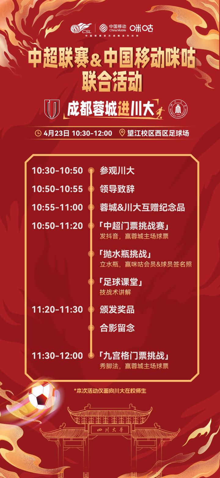 4月23日成都蓉城走进四川大学 与川大师生互动 咪咕体育 咪咕体育2024-04-21 17:03中超联赛&咪咕联合品牌活动成都蓉城进川大,中超劲旅成都蓉城足球俱乐部将走进四川大学,与川大师生近距离接触,开展一系列精彩活动,参与进来,就有机会赢取中超周边好礼!⏰4月23日上午川大望江校区西区足球场,一起共赴热爱!展开更多