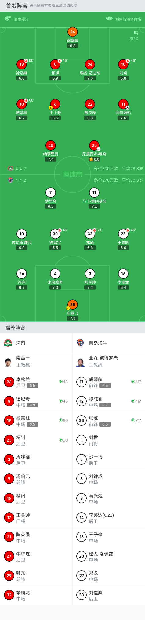 上场替补:46分钟24-李松益, 46分钟8-德尼奇, 90+1分钟23-柯钊, 60分钟19-杨意林