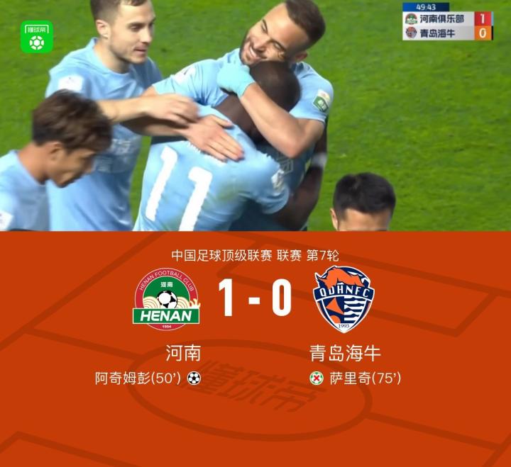 北京时间4月21日中国足球顶级联赛 联赛 第7轮,河南主场对阵青岛海牛。上半场,许东助攻王建明破门被吹越位无效;下半场,黄紫昌伤退,萨里奇点射罚丢错失扳平机会,主裁判麦麦提江多次判罚引起争议。最终,河南1-0力克海牛,迎来赛季首胜。