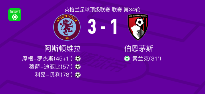 在英格兰足球顶级联赛第34轮比赛中,阿斯顿维拉队主场迎战伯恩茅斯队。摩根-罗杰斯、穆萨-迪亚比和利昂-贝利分别为阿斯顿维拉队攻入进球,而伯恩茅斯队的索兰克也有一次得分。最终比分为阿斯顿维拉 3-1 伯恩茅斯。