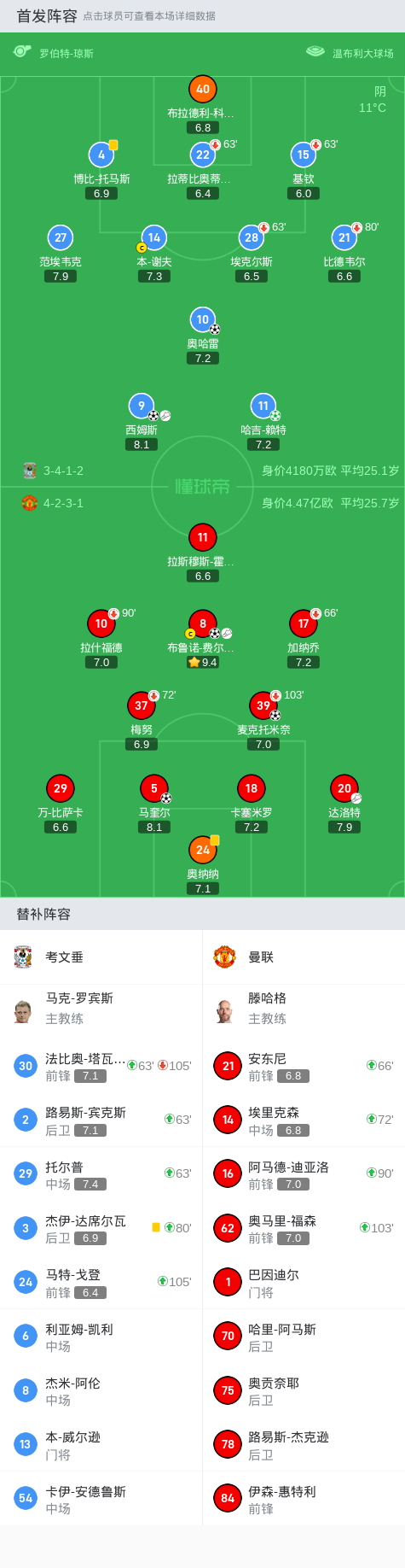 上场替补:72分钟14-埃里克森, 66分钟21-安东尼, 90+7分钟16-阿马德-迪亚洛, 103分钟62-奥马里-福森