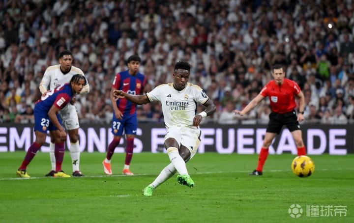 在西甲第32轮主场迎战巴塞罗那的西班牙国家德比中,维尼修斯在上半场第18分钟点球破门为皇家马德里扳平比分。