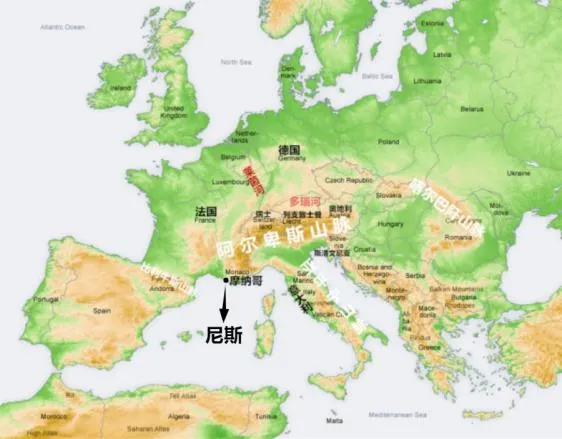 尼斯位于阿尔卑斯山的南麓,也是地中海西岸的重要港口城市。