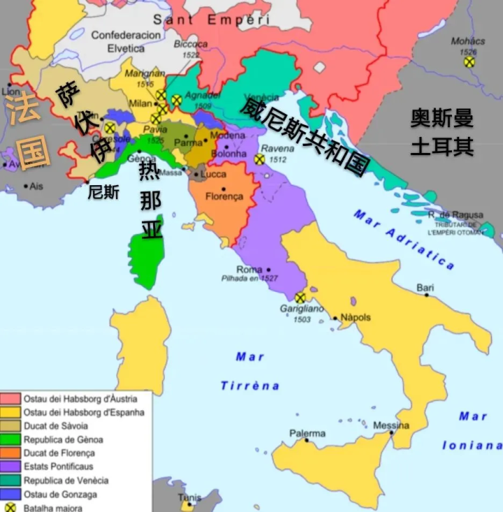 意大利半岛不仅长期四分五裂,而且是豪强竞逐的角斗场。亚平宁半岛东北部和中部一直以来是哈布斯堡家族觊觎的目标。西北部则被法国觊觎。