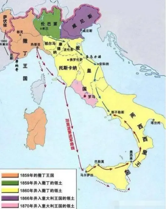 1860年,在法国的帮助下,撒丁王国将除了东北部威尼斯之外的北方地区全部统一。
