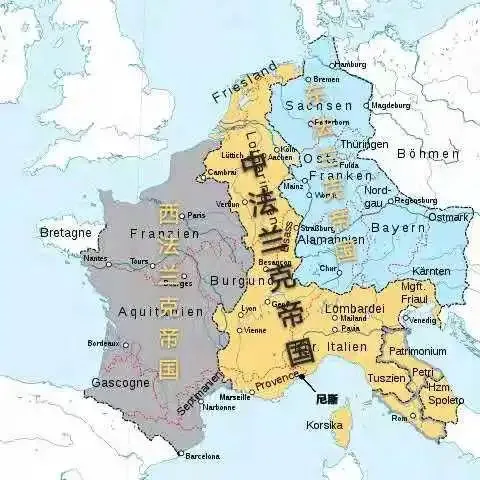 公元843年,法兰克王国被查理曼大帝的三个孙子瓜分,成为了东西中三个法兰克王国。西法兰克王国就是法兰西的雏形;中法兰克王国是意大利的雏形;东法兰克王国是德意志的雏形。