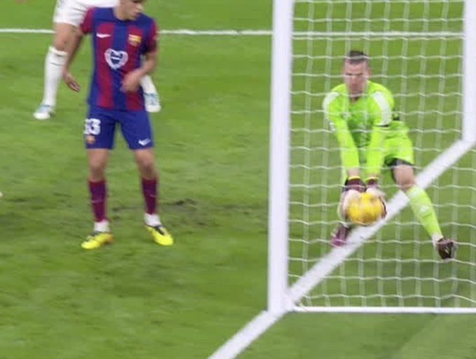 西班牙国家德比上半场第28分钟,亚马尔利用一次角球机会抢前点背对球门外脚背巧射,皮球被皇马门将卢宁双手托出,但这个进球是否整体越过了门线成为了全场瞩目的焦点。