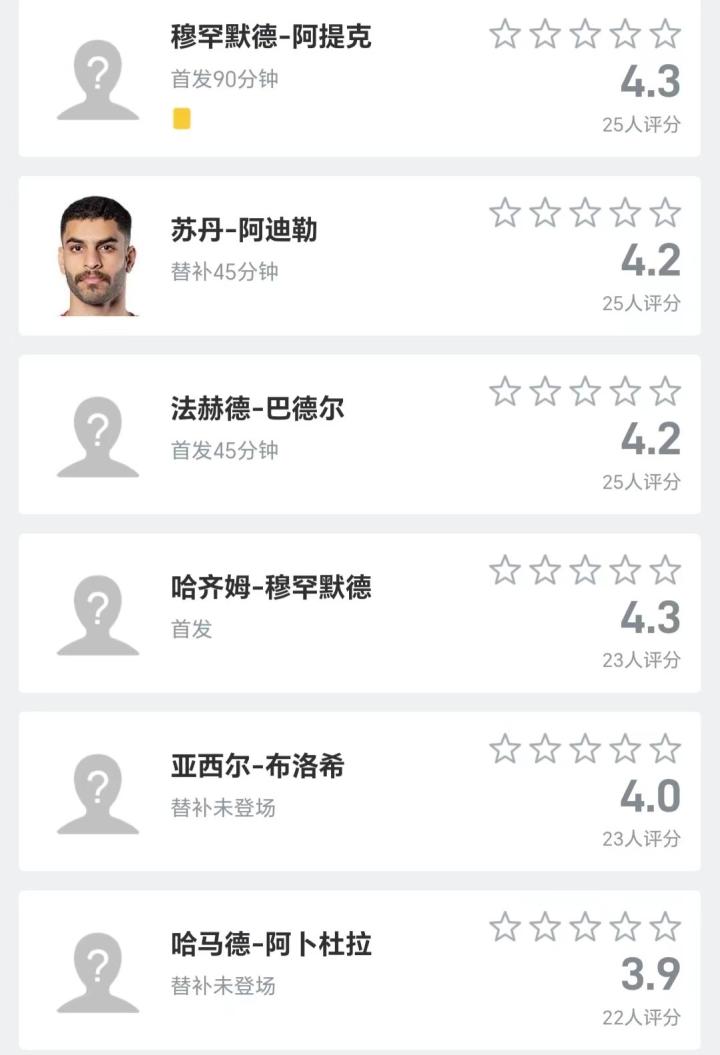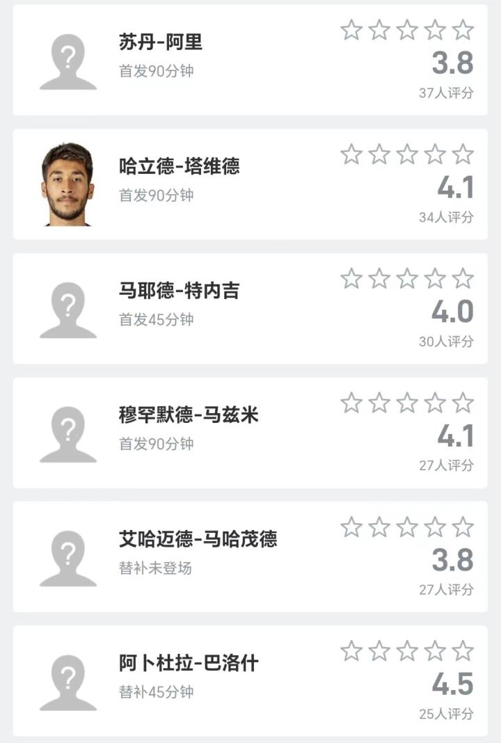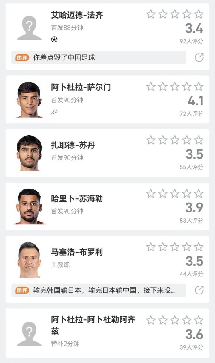 本场比赛,中国U23方面,打入一球的谢文能评分9.3分评分最高,送出失误的中后卫阮奇龙评分4.1分最低;而阿联酋U23方面,打入一球的艾哈迈德-法齐评分3.4分最低。而主裁判侯赛因-阿博耶西亚仅得到2.7分。