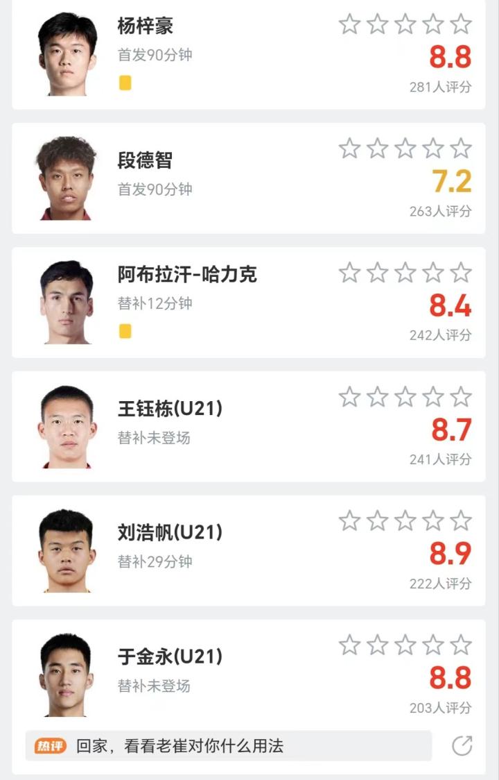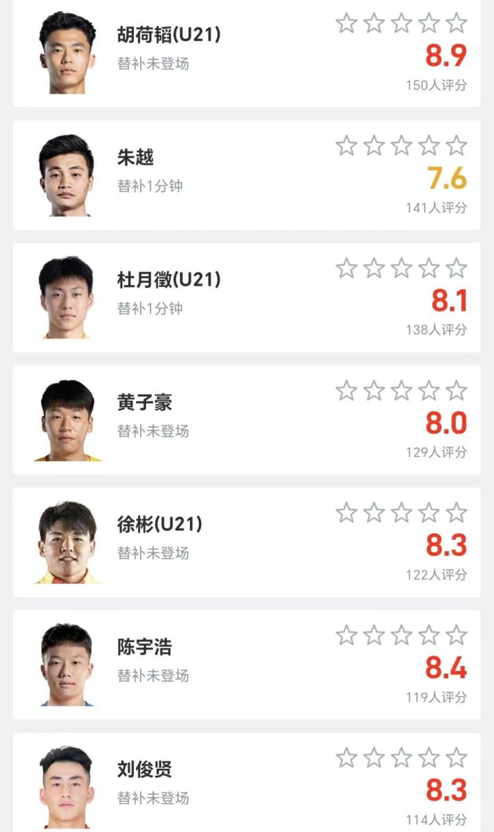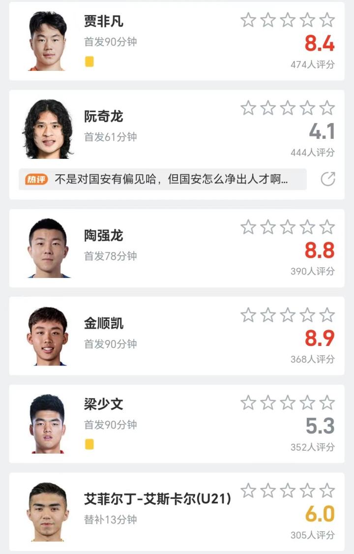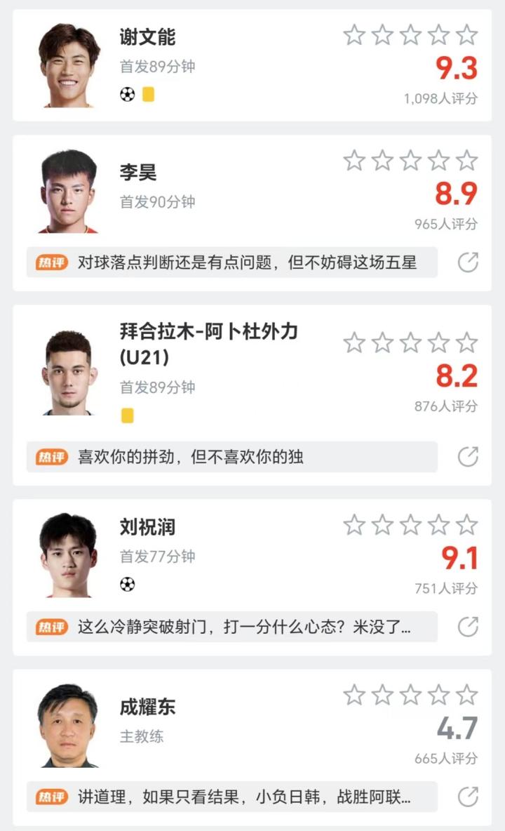 中国U23vs阿联酋U23我懂球迷评分:谢文能9.3分,阮奇龙4.1分