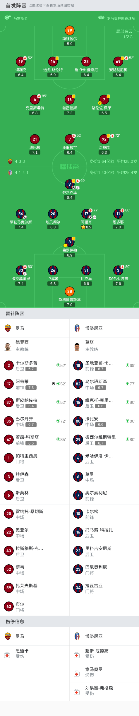 罗马首发:92-沙拉维, 16-帕雷德斯, 21-迪巴拉, 4-克里斯坦特, 14-迭戈-略伦特, 69-安赫利尼奥, 19-切利克, 7-洛伦佐-佩莱格里尼, 99-斯维拉尔, 9-亚伯拉罕, 23-詹卢卡-曼奇尼
