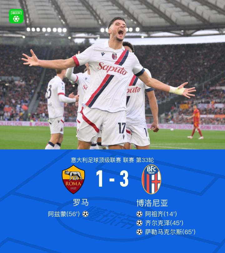 第45分钟,阿祖齐送助攻,齐尔克泽破门扩大比分,罗马0-2博洛尼亚