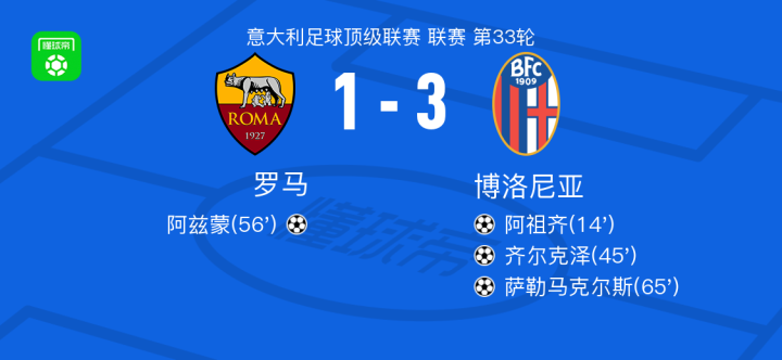 北京时间4月23日罗马vs博洛尼亚,阿祖齐贡献1球,1助攻,1次关键传球,1次射门。
