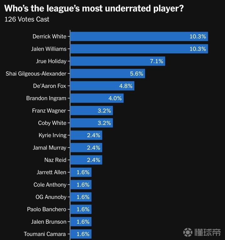 此外,在联盟中最被低估的球员中,德里克-怀特和杰伦-威廉姆斯10.3%的得票率并列第一,朱-霍勒迪以7.1%排名第三,亚历山大5.6%第四,福克斯4.8%第五。