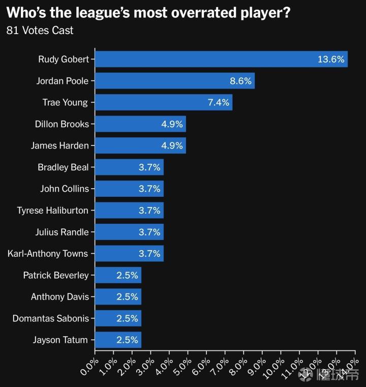在联盟中谁是最被高估的球员评选时,戈贝尔以13.6%的得票率当选第一,乔丹-普尔也以8.6%得票率紧随其后,特雷-杨7.4%排在第三。