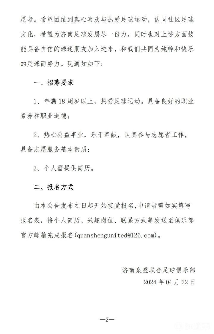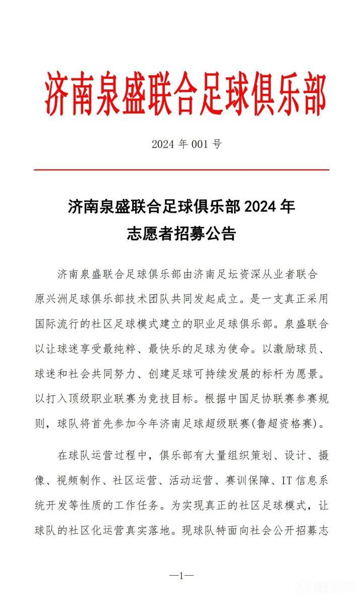 另外,济南泉盛联合发布了招募志愿者的公告,称本赛季将首先征战济南足球超级联赛(鲁超资格赛)。
