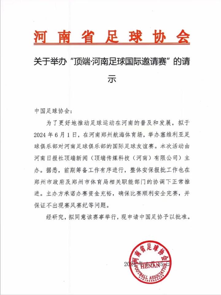 近日,一份疑似名为顶端·河南足球国际邀请赛的策划书正在互联网上流传。根据该计划书内容,本项赛事将由河南队赞助商顶端传媒冠名。河南队将在今年6月1日与来自西甲的塞维利亚队在主场航海体育场进行商业赛,西班牙球星拉莫斯届时也将出席。