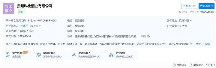 据天眼查显示,的确存在“贵州科比酒业有限公司”,该公司成立于2023年8月14日,注册资本1000万人民币,公司地址位于贵州贵阳。