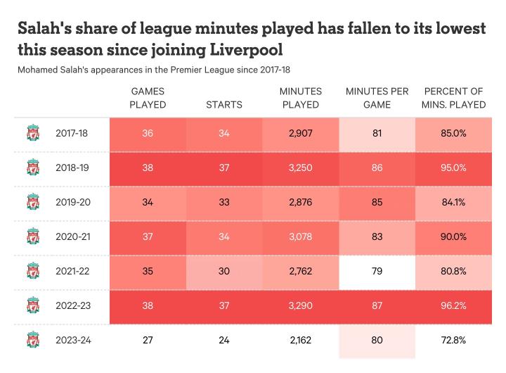 一方面,萨拉赫成为了他自己在安菲尔德过去六个赛季所设立的高标准的牺牲品。另一方面,他刚从一次不常见的长期伤病中恢复过来。本赛季,他的出场时间仅占全部时间的73%,这是他自从罗马转会至利物浦以来的最低比例。