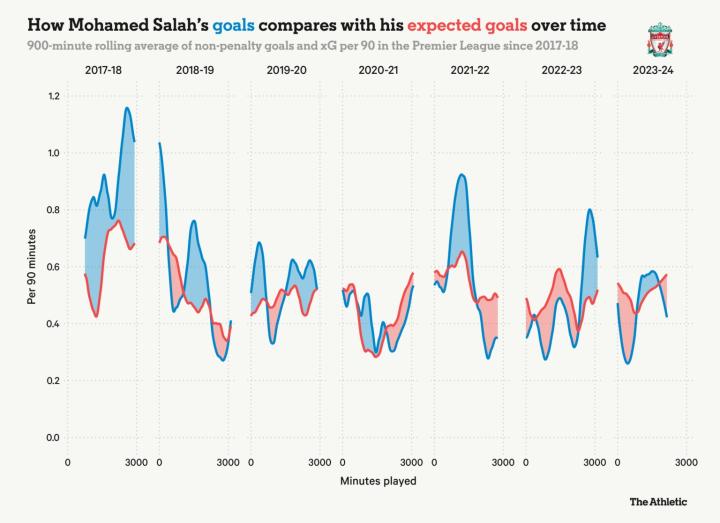 在深入分析萨拉赫自从加盟利物浦后的每个赛季的进攻数据时,我们发现他本赛季在英超联赛中的每90分钟预期进球(xG)实际上达到了个人的最高值——0.77。这个数据表明,他大概每4场比赛就能获得3次进球良机。不过,需要注意的是,他本赛季获得了7个点球,这也是他效力英超赛季期间最多的一个赛季,预期进球无疑受到了部分影响。