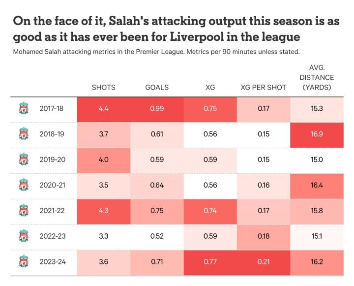 除了场上表现下滑外,讨论萨拉赫相对低迷的状态也是有充分理由的。