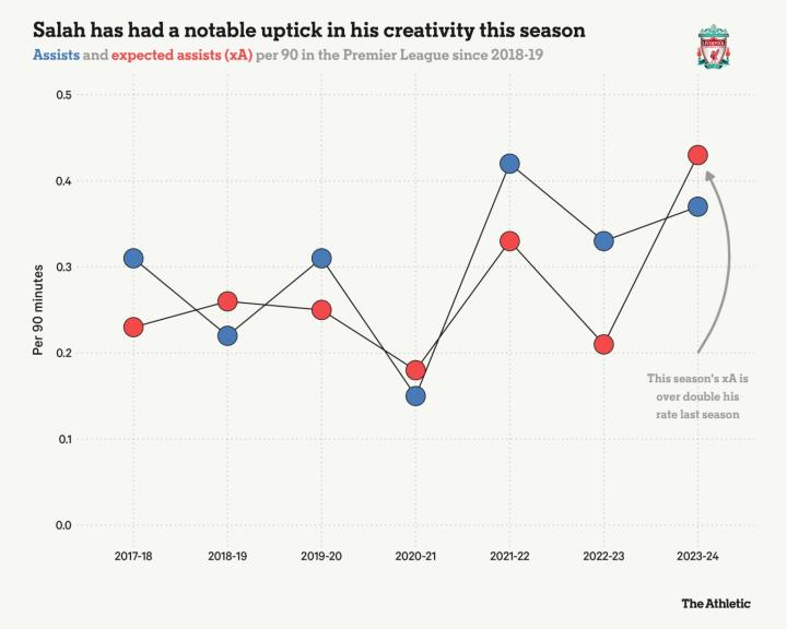 在考虑到阿诺德因伤缺阵的情况下,本赛季没有任何利物浦球员在他们参与的四项赛事中创造出比萨拉赫更多的机会。他的预期联赛助攻数(xA),场均达到0.4,这是他身披利物浦战袍以来的最佳表现。