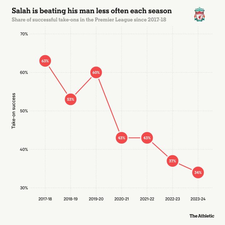 过去,萨拉赫以其充满活力和高超技巧的个人突破能力著称,能够连续过掉多名对手。然而在本赛季,他在这方面的表现有所减弱:他每90分钟的个人突破次数降至2.9次,低于他过去两个赛季的数据,而且这还是他首次同时缺少了马内或菲尔米诺这样的前场搭档。