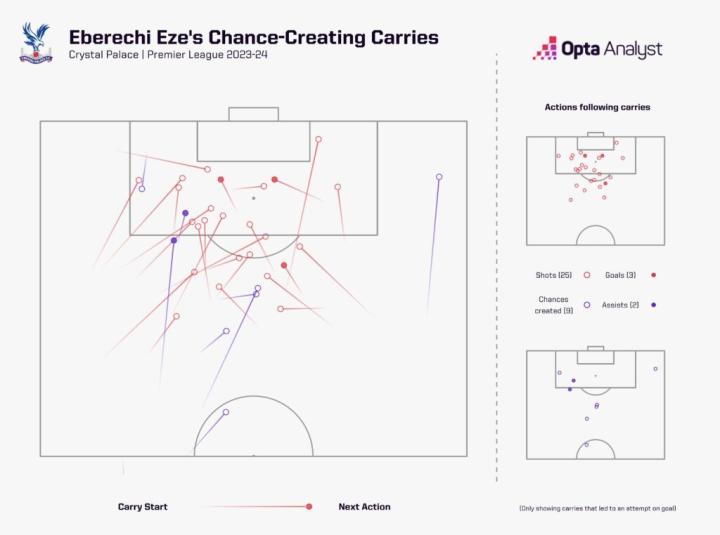 埃泽的盘带次数的增加表明了他的球场策略的改变。在他前三个英超赛季中,他平均每90分钟完成3.9次盘带,但本赛季已经提高到了5.9次。尽管上赛季他的成功率达到了令人印象深刻的62.9%,本赛季尽管成功率降至50%,但由于尝试次数增加,他已经超过了上赛季完成的总盘带次数。此外,埃泽未成功的盘带尝试偶尔也可能为其他球员创造空间,因此仍可能给水晶宫的对手带来麻烦。
