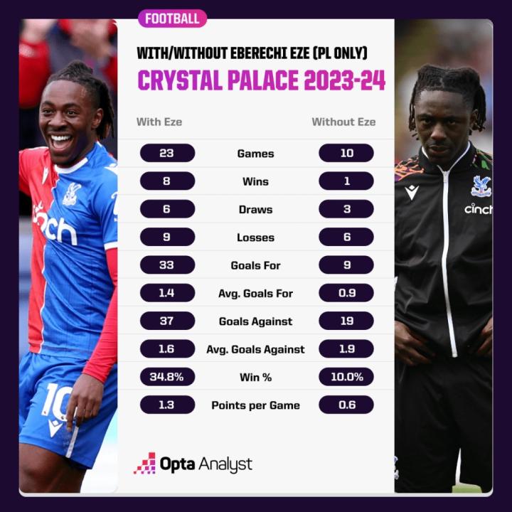 埃泽并非这场演出唯一的明星。像往常他们两人都上场时一样,埃泽身旁还有同样令人印象深刻的迈克尔-奥利塞,他也以一个进球和一次助攻结束了比赛。本赛季,当他们两人都可用时,水晶宫在英超的实力差异是明显的。由于埃泽和奥利塞在23-24赛季都遭遇了伤病问题,他们只能共同首发水晶宫33场联赛中的6场。在这6场比赛中,水晶宫4胜2负,平均每场比赛进2.3球。在至少有一人缺席的27场比赛中,他们5胜9平13负,平均每场比赛进1球。