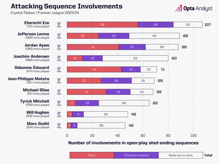 截至上周三与纽卡斯尔联队的主场比赛之前,本赛季埃泽在英超联赛中为水晶宫在进攻中参与的开放式进攻序列中遥遥领先,达到了107次。他不仅尝试的射门次数(56次)多于任何队友,而且创造的机会(28次)也多于任何队友。