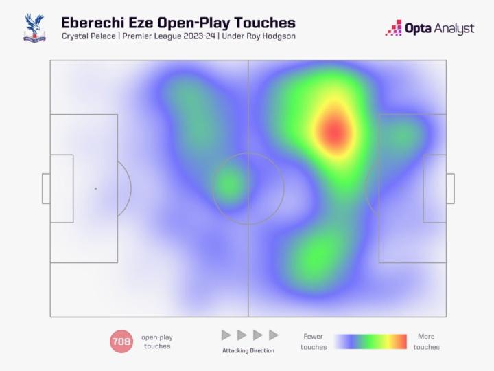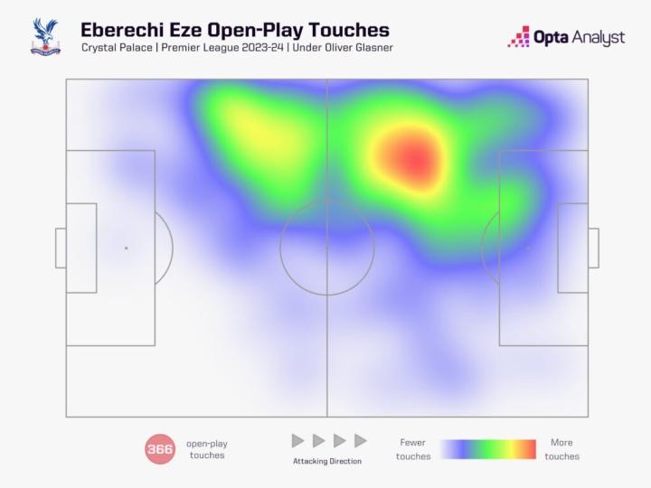 水晶宫最近表现的整体改善理所当然地归功于格拉斯纳的影响,而埃泽是在这位奥地利教练的指导下茁壮成长的球员之一。他本赛季大部分时间都是从左边路出击,但自从格拉斯纳到来以后,他更多地留在了那边——正如下面的热图所示,这有助于提供更多的宽度,同时也意味着埃泽不必像过去那样经常离开他制造威胁的位置。