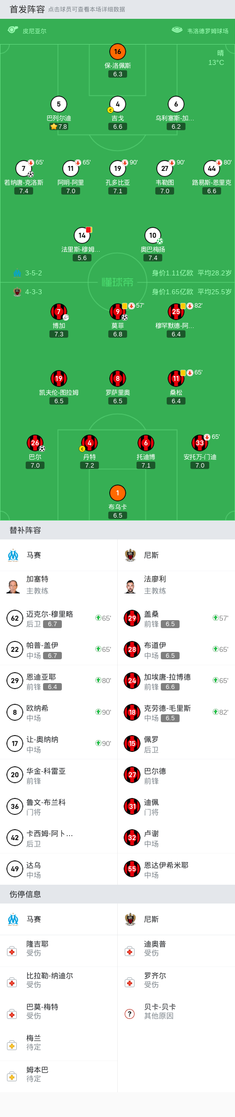 尼斯首发:4-丹特, 11-桑松, 7-博加, 8-罗萨里奥, 1-布乌卡, 9-莫菲, 26-巴尔, 6-托迪博, 19-凯夫伦-图拉姆, 33-安托万-门迪, 25-穆罕默德-阿里-肖