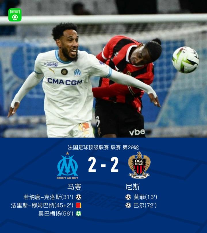 4月25日,法国足球顶级联赛迎来第29轮的激烈对决,马赛与尼斯展开了一场激动人心的比赛。上半场,博加助攻莫非破门率先改写比分,若纳唐-克洛斯抽射破门将比分扳平。法里斯-穆姆巴纳两黄变一红被罚下。下半场,博加越位在先进球被吹无效。阿里-肖犯规送点,奥巴梅扬主罚一蹴而就,巴尔外围远射破门将比分扳平。补时最后一分钟奥巴梅扬的挑射击中横梁。最终十人马赛2-2战平尼斯。