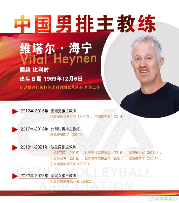 4月25日,中国排协发布公告,公布本期集训名单,同时宣布比利时籍教练维塔尔-海宁为中国男排主教练。