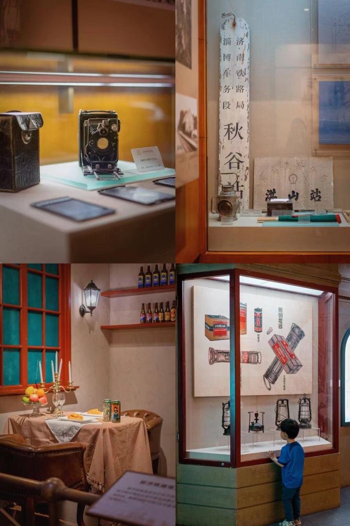 博物馆如今是免费开放的,刷身份证就能进入,注意好闭馆时间就可以了。展区四个主题:胶济铁路的修建背景及过程、对山东社会经济发展的影响、风雨沧桑路、迈向新时代,以及四个专题展区,贯穿在整座哥特建筑里。展区以实物藏品为主,还复刻了许多那个年代的真实场景,所以哪怕是学龄前小朋友也能看懂,我们托班的娃在里面一个个物品研究。