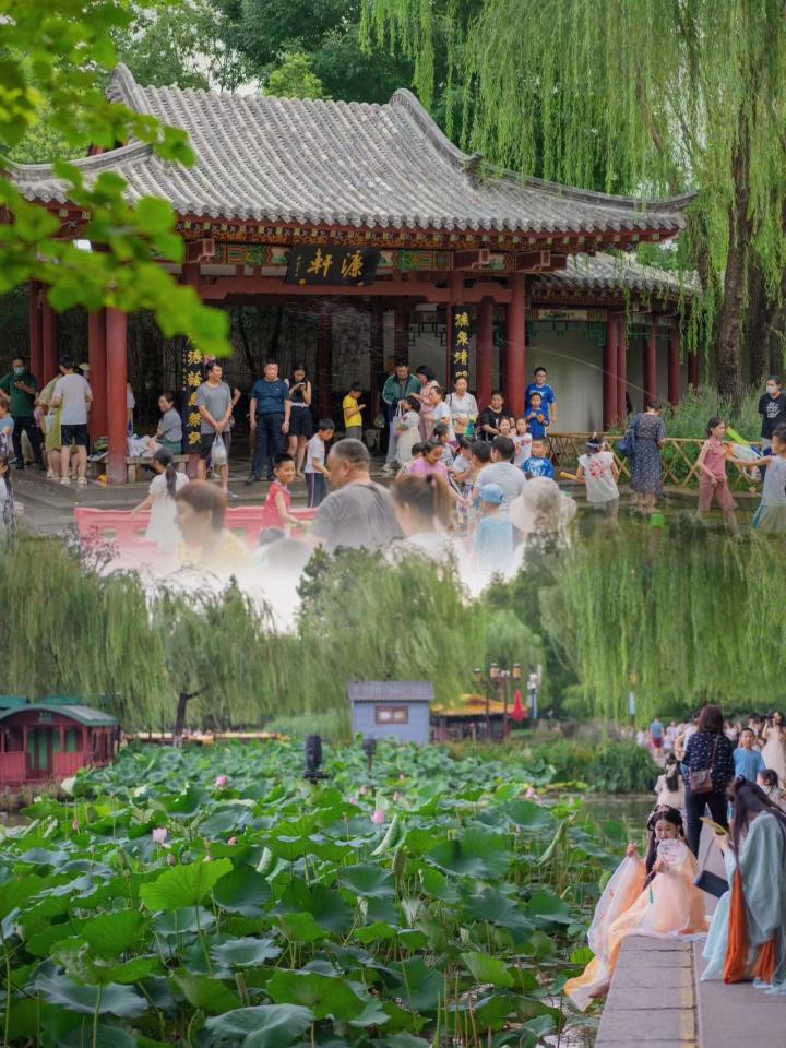 人人都知道济南72名泉,特别是把保安都快挤下水的趵突泉,其实济南水系有多发达呢,加起来大大小小的泉眼有1209处。我们首先去了本地孩子的玩水胜地,一座免费的公园五龙潭,跟着装备齐全的孩子们一路绕进戏水区,清澈的泉水刚刚好莫过孩子们的脚踝,足够给水枪装水又不怕小小孩摔倒,还真是一个绝佳的“战场”!
