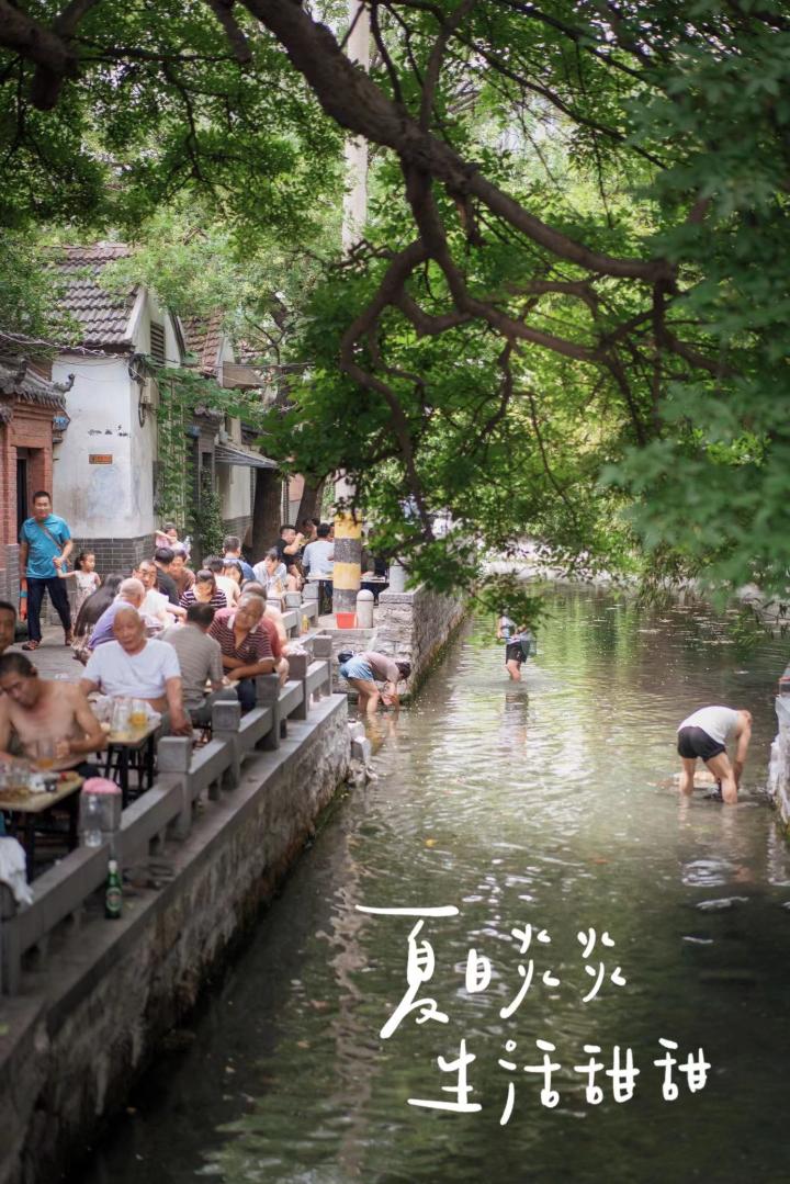 离开公园后沿着蜿蜒不断的泉水我们边走边看,只为摸索到理想中的泉城夏日景象,一种远离游客,一种当地人的生活与泉水相融的画面。最后在停车场大爷的帮助下,我们来到了于家桥,在这条巷子里,男人们光着膀子在水边吃饭,有人在浆洗衣物,有人在水里捞鱼……