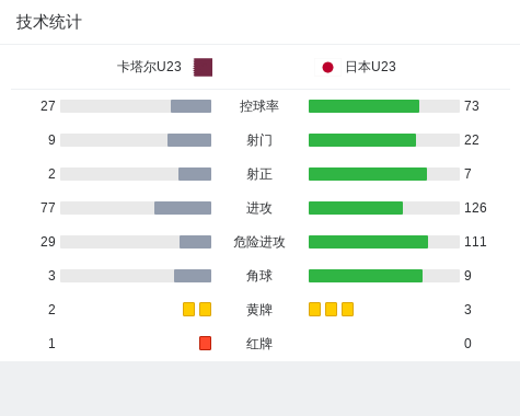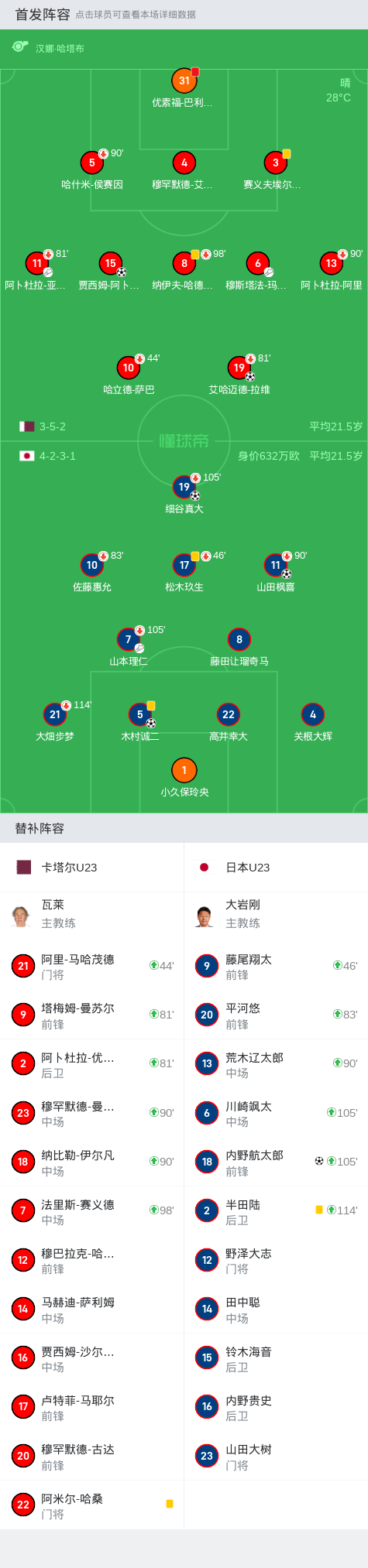 卡塔尔U23首发:6-穆斯塔法-玛莎勒, 13-阿卜杜拉-阿里, 4-穆罕默德-艾阿什, 10-哈立德-萨巴, 8-纳伊夫-哈德拉米, 31-优素福-巴利亚德, 15-贾西姆-阿卜杜勒萨拉姆, 3-赛义夫埃尔登-法德拉拉, 19-艾哈迈德-拉维, 11-阿卜杜拉-亚齐迪, 5-哈什米-侯赛因