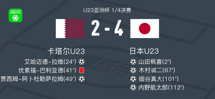 北京时间4月25日U23亚洲杯 1/4决赛,卡塔尔U23主场对阵日本U23。卡塔尔U23艾哈迈德-拉维破门,贾西姆-阿卜杜勒萨拉姆破门。日本U23山田枫喜破门,木村诚二破门,细谷真大破门,内野航太郎破门。最终比分卡塔尔U23 2-4 日本U23。