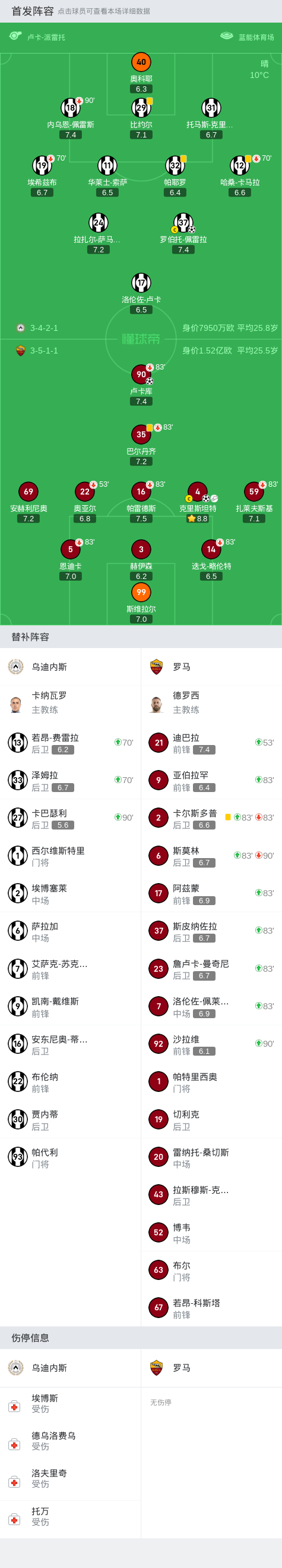 罗马首发:90-卢卡库, 16-帕雷德斯, 4-克里斯坦特, 14-迭戈-略伦特, 69-安赫利尼奥, 99-斯维拉尔, 22-奥亚尔, 5-恩迪卡, 59-扎莱夫斯基, 35-巴尔丹齐, 3-赫伊森