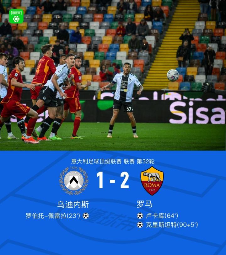 北京时间4月26日,意大利足球顶级联赛第32轮,乌迪内斯在主场迎战罗马。上半场卢卡前插倒在禁区内,裁判表示没有问题,奥亚尔禁区调整低射偏出,巴尔丹齐外围凌空低射被扑,赫伊森停球失误送礼,罗伯托-佩雷拉破门先拔头筹,下半场帕雷德斯外围劲射,皮球被门将扑出,克里斯坦特精准助攻卢卡库头槌破门扳平比分,第71分钟出现突发状况,恩迪卡因气胸问题比赛被腰斩,在补赛尾声阶段,迪巴拉角球送出助攻,克里斯坦特头球破门绝杀比赛,最终,罗马以2-1战胜乌迪内斯。