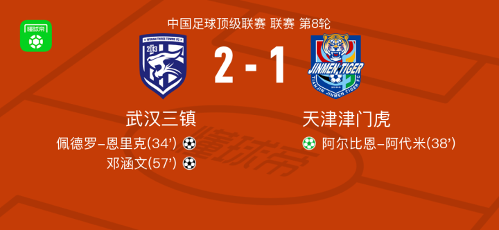 武汉三镇vs天津津门虎球员评分:姜至鹏7.6分,韩鹏飞6.1分