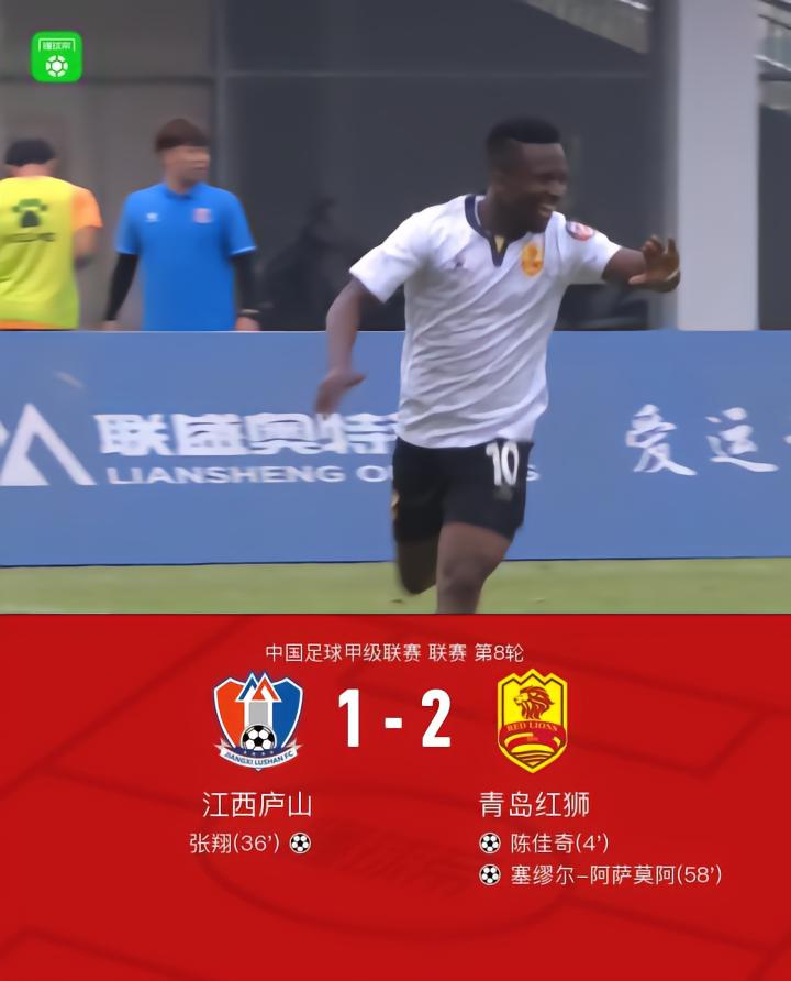 北京时间4月27日下午15:35,中甲联赛第8轮,江西庐山对阵青岛红狮。上半场,陈佳奇头球闪电破门,张翔扳平比分。下半场,阿萨莫阿爆射破门。最终,江西庐山1-2青岛红狮。