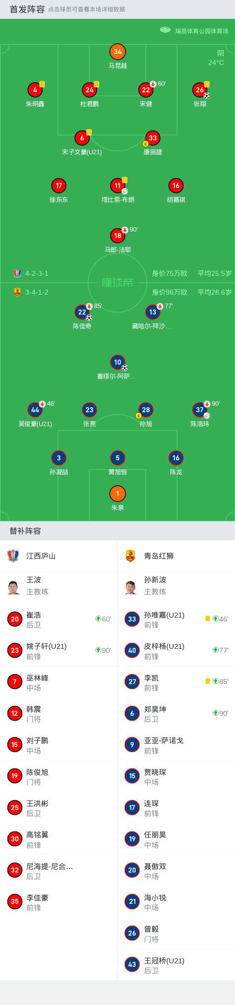 江西庐山首发:24-杜君鹏, 33-康振捷, 22-宋健, 34-马昆越, 4-朱明鑫, 16-胡嘉祺, 17-徐东东, 26-张翔, 6-宋子文豪, 11-塔比索-布朗, 18-马郎-法耶