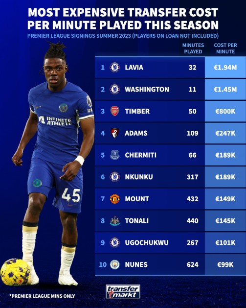 去年夏天英超各家俱乐部在转会市场上投入了超过10亿英镑,其中包括了科尔-帕尔默、麦卡利斯特以及赖斯这样的成功交易,但也有一些高成本的交易未达到预期的效果,德转就对此统计出了本赛季英超联赛中每分钟出场时间转会成本最高的10名球员,切尔西占据4席。