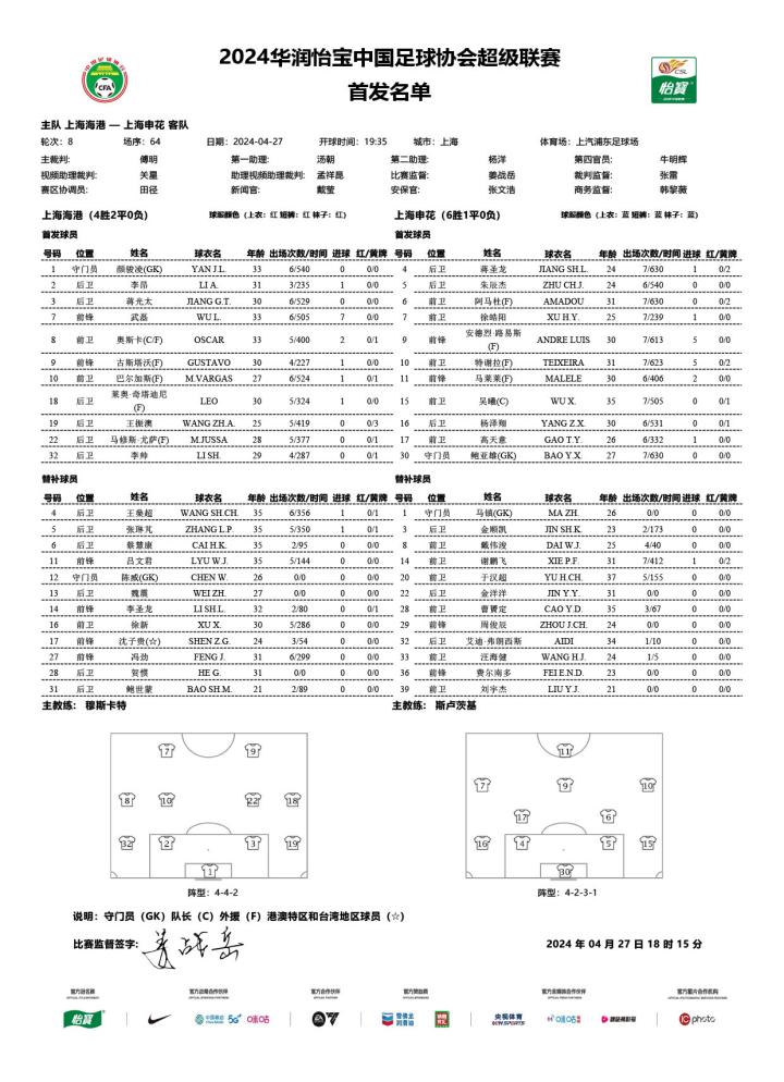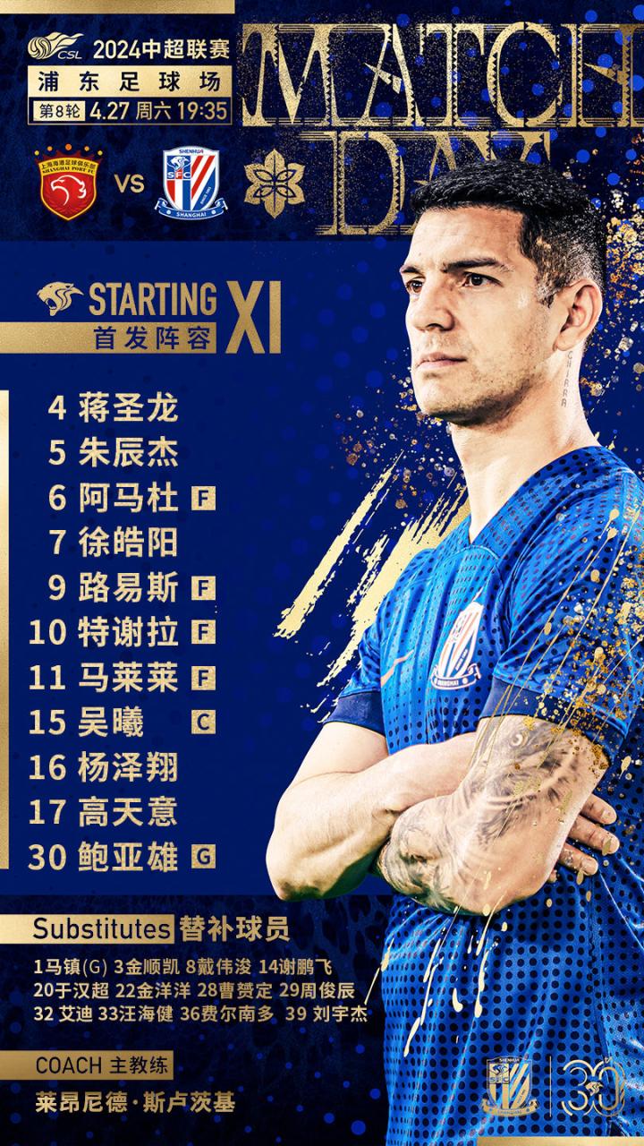 #奋楫2024# 2024中超联赛第8轮 上海海港vs上海申花 首发名单