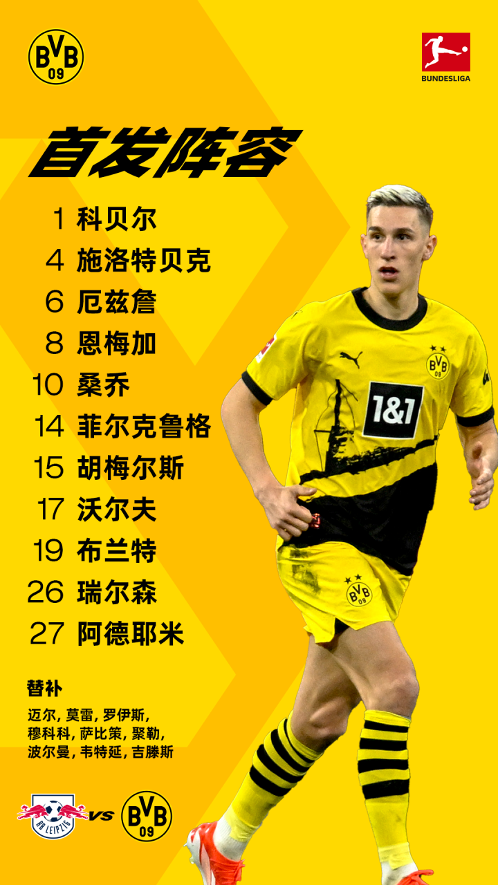 🆚莱比锡 首发出炉首发 - 科贝尔,瑞尔森,施洛...多特蒙德足球俱乐部 @懂球帝2024-04-27 20:34🆚莱比锡 首发出炉 首发 - 科贝尔,瑞尔森,施洛特贝克,胡梅尔斯,沃尔夫,厄兹詹,恩梅加,布兰特,阿德耶米,桑乔,菲尔克鲁格 替补 - 迈尔,莫雷,罗伊斯,穆科科,萨比策,聚勒,波尔曼,韦特延,吉滕斯展开更多