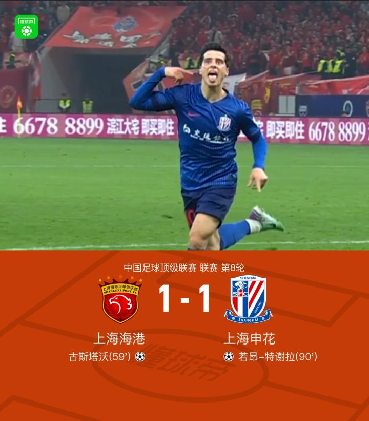 北京时间4月27日中国足球顶级联赛联赛第8轮,上海海港主场对阵上海申花。比赛第59分钟,古斯塔沃乱战中率先破门,第90分钟,特谢拉禁区内停球后射门扳平,补时第7分钟,汪海健绝杀因于汉超越位在先被吹。最终比分上海海港1-1上海申花。